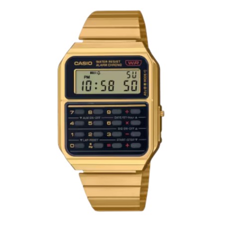 Reloj calculadora vintage metálico con dual time, cronógrafo 1/100 s y alarma diaria. El Casio CA‑500WEG‑1A une estética 80s con precisión japonesa.
